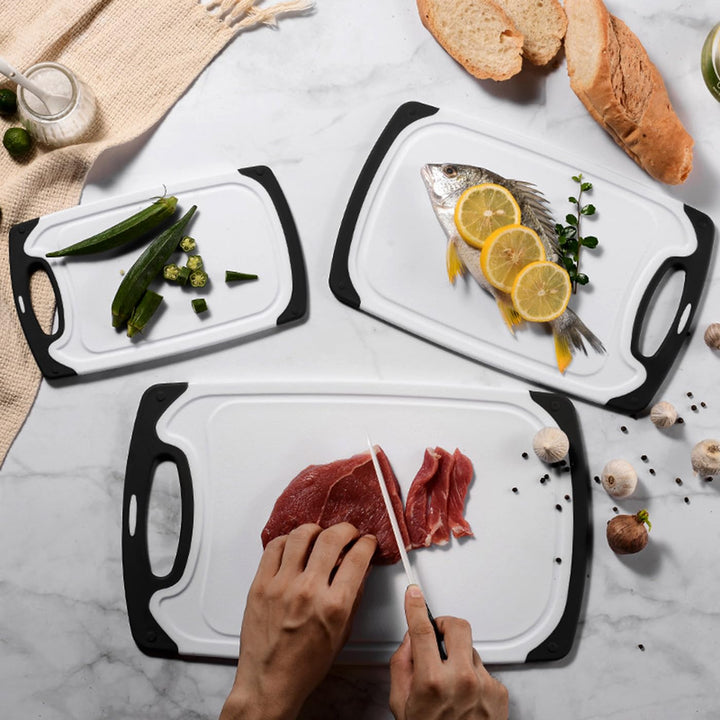 This multifunctional cutting board set includes 3 different sizes (15.8 inches, 12.5 inches, 9.8 inches) and colors, which can better distinguish the uses. I use the small size to cut fruits, the medium size to cut cooked food and lettuce for direct consumption, and the large size to make pasta and burritos, and a quick and delicious lunch chicken burrito