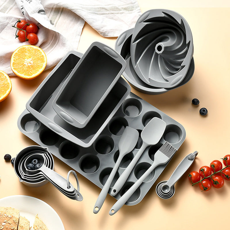 18 PCS Silicone Bakeware Sets Non Toxic with Square/Round Cake Pan, Cupcake Molds, Spatula, Baking Brush and Measuring cups Commerical Bakeware Dishwasher Safe